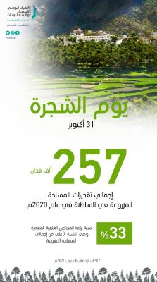 أفاد الحساب الرسمي للمركز الوطني للإحصاء والمعلومات، بمناسبة يوم الشجرة العماني، أن إجمالي تقديرات المساحة المزروعة في السلطنة في عام 2020م قد بلغ 257 ألف فدان.