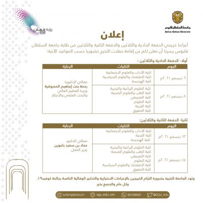وهج الخليج-مسقط أعلنت جامعة السلطان قابوس اليوم عبر حسابها الرسمي "تويتر" عن إقامة حفل التخرج حضوريا لدفعتي ٣١ و٣٢ حسب المواعيد الموضحة.
