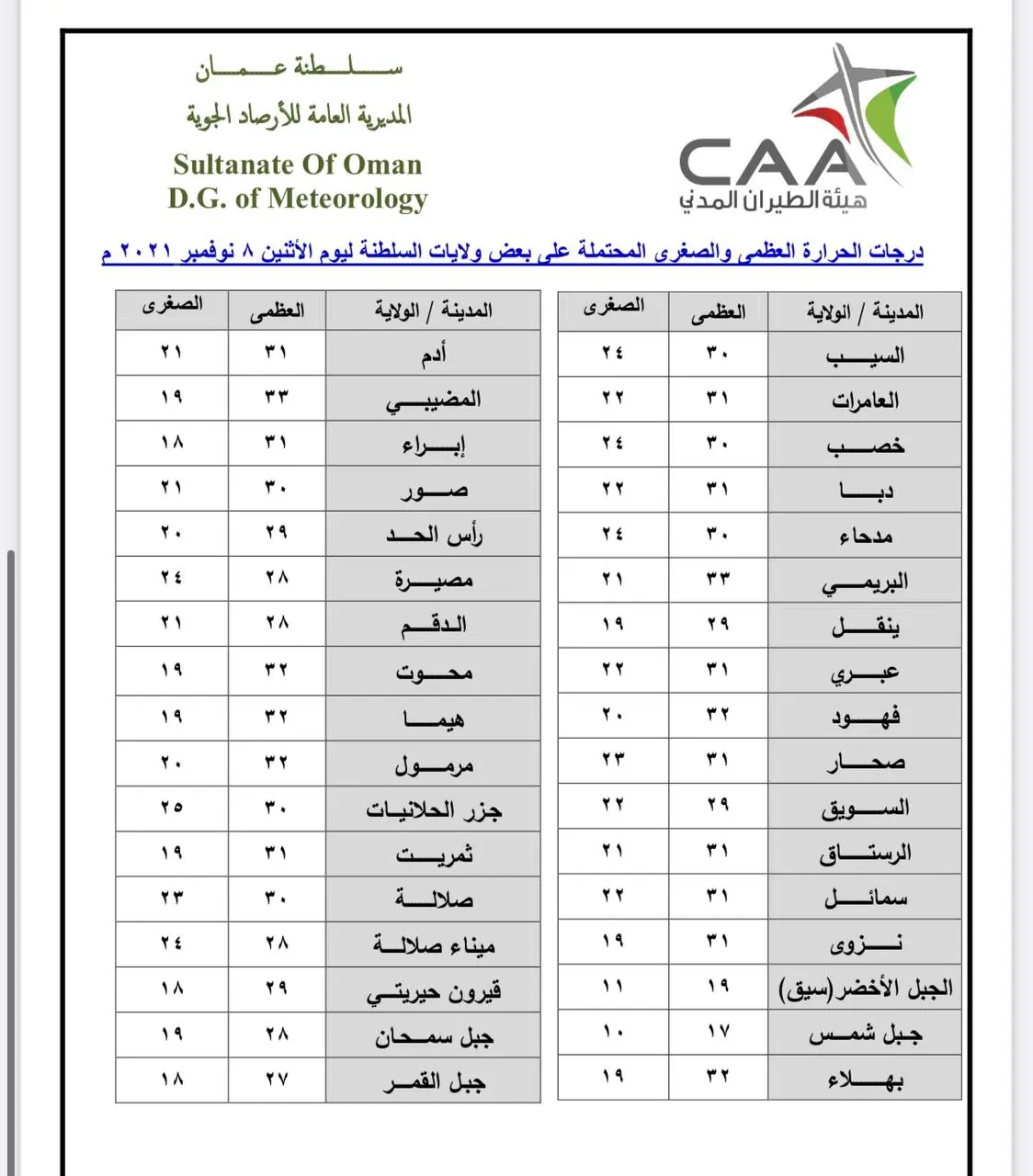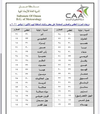 وإليكم درجات الحرارة في مختلف مناطق السلطنة: