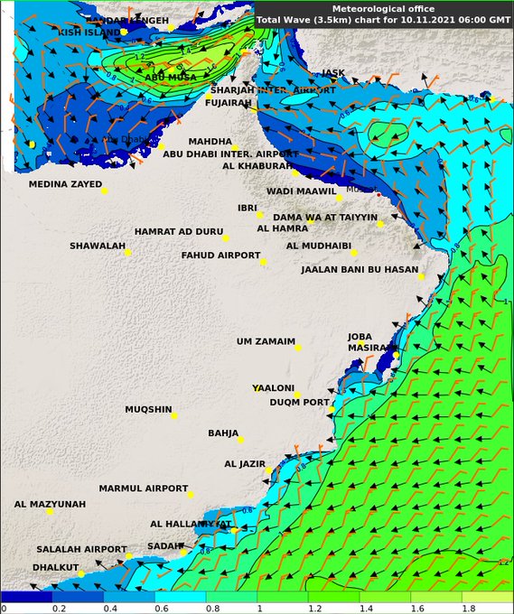نبهت الأرصاد الجوية العمانية عن توقعات بارتفاع موج البحر على السواحل المطلة على محافظة مسندم إلى متوسط الموج (مترين) ويكون البحر هادئ إلى متوسط الموج (1.5)متر على السواحل المطلة على بحر العرب يوم غد .