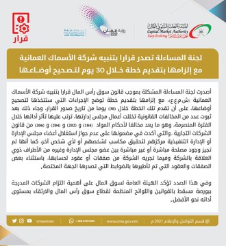 أصدرت لجنة المساءلة بالهيئة العامة لسوق المال قرار بتنبيه شركة الأسماك العمانية مع إلزامها بتقديم خطة خلال 30 يوم لتصحيح أوضاعها.