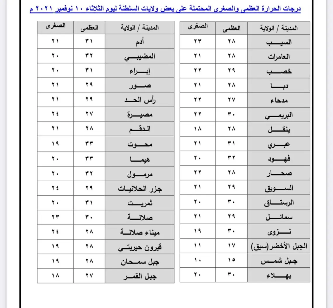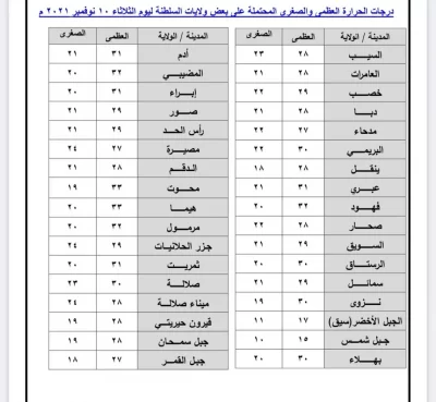 وإليكم درجات الحرارة في مختلف ولايات السلطنة: