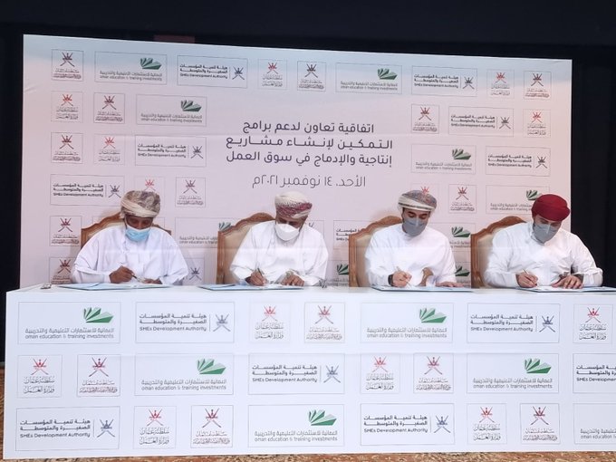 وقع كل من وزارة العمل ووزارة التنمية الإجتماعية وهيئة تنمية المؤسسات الصغيرة والمتوسطة والشركة العمانية للاستثمارات التعليمية والتدريبية اتفاقية تعاون تقضي بتأهيل عدد من الباحثين عن عمل من أفراد أسر الضمان الاجتماعي والدخل المحدود وتدريبهم وتمكينهم من إنشاء مشروعات إنتاجية في القطاع الصناعي لتكون من المؤسسات الصغيرة والمتوسطة.
