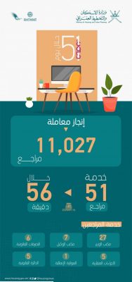 قالت وزارة الإسكان والتخطيط العمراني أنه تم إنجاز أكثر من (11) ألف معاملة خلال (51) يومًا، وخدمة (51) مراجع خلال (56) دقيقة فقط بقاعة الخدمة الموحدة بديوان عام الوزارة .