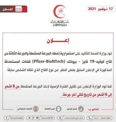 وهج الخليج_ مسقط أعلنت وزارة الصحة عن تقليل الفترة الزمنية لأخذ الجرعة المنشطة من لقاح كوفيد_١٩ من 8 أشهر إلى 6 أشهر .