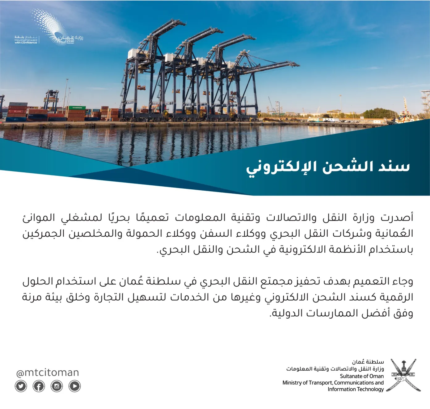 أصدرت وزارة النقل والاتصالات وتقنية المعلومات تعميما بحريا لمشغلي الموانئ العمانية وشركات النقل البحري ووكلاء السفن ووكلاء الحمولة والمخلصين الجمركيين باستخدام الأنظمة الإلكترونية في الشحن والنقل البحري.