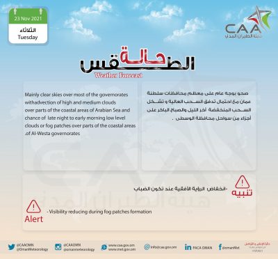 وهج الخليج-مسقط الأرصاد العمانية : حالة الطقس المتوقعة اليوم :