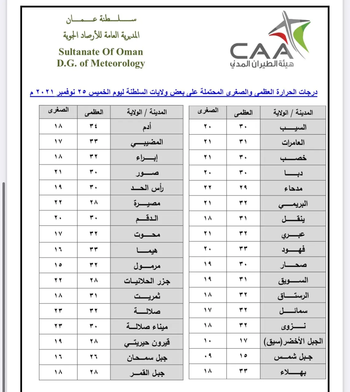 إليكم درجات الحرارة في بعض مناطق السلطنة: