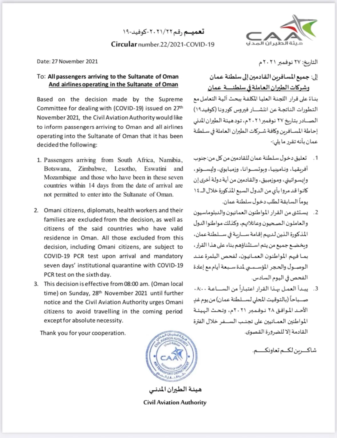 وهج الخليج_ مسقط أصدرت هيئة الطيران المدني تعميما حول القادمين من جنوب أفريقيا و ناميبيا و بوتسوانا وزمبابوي وليسوتو وإيسواتيني وموزمبيق ابتداء من الأحد 28 نوفمبر.