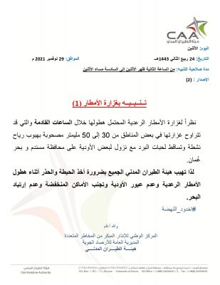 وهج الخليج-مسقط هيئة الطيران المدني تصدر تنبيهًا بغزارة الأمطار خلال الساعات القادمة.