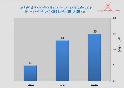 وهج الخليج_ مسقط توزيع هطول الأمطار على عدد من ولايات السلطنة خلال الفترة من يوم 29 إلى 30 نوفمبر 2021م (حتى الساعة 4 مساءً):