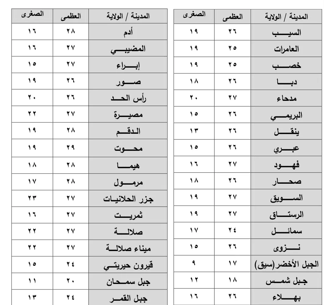 إليكم درجات الحرارة في بعض ولايات ومناطق السلطنة: