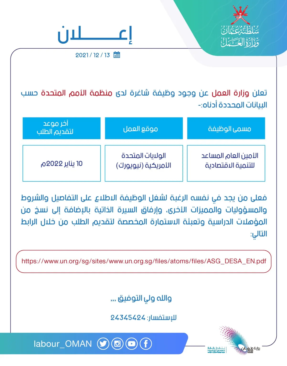 أعلنت وزارة العمل عن وجود وظيفة شاغرة لدى منظمة الأمم المتحدة حسب البيانات المحددة أدناه: