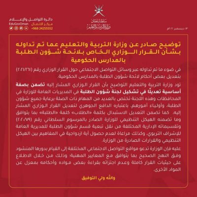 أصدرت وزارة التربية والتعليم توضيحا عما تم تداوله بشأن القرار الوزاري الخاص بلائحة شؤون الطلبة بالمدارس الحكومية، فيما يلي نصه: