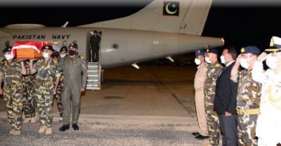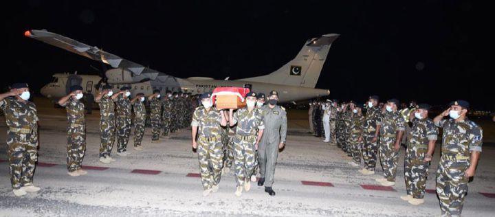 وقد وصل الجثمان على متن طائرة عسكرية تابعة للقوات المسلحة الباكستانية وكان في استقباله أيضا عددٌ من كبار الضباط والضباط بالبحرية السُّلطانية العمانية، كما كان في الاستقبال سعادة سفير جمهورية باكستان الإسلامية المعتمد لدى سلطنة عُمان، والملحق العسكري بالسفارة الباكستانية بمسقط .