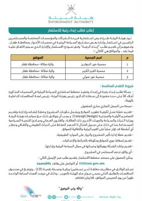 طرح حساب هيئة البيئة عبر موقع “تويتر” فرص استثمارية فريدة للشركات والمؤسسات المختصة والمستثمرين الراغبين في استثمار وإدارة بعض مشاريع السياحة البيئية في محميات الأخوار بمحافظة ظفار.