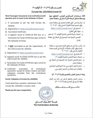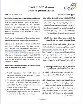 أصدرت هيئة الطيران المدني تعميمًا حول تنقل مواطني سلطنة عمان و دولة الإمارات العربية المتحدة بين البلدين عبر المنافذ الجوية، والتحقق الإلزامي من استيفاء جميع القادمين إلى سلطنة عمان للاشتراطات قبل الصعود إلى الطائرة.
