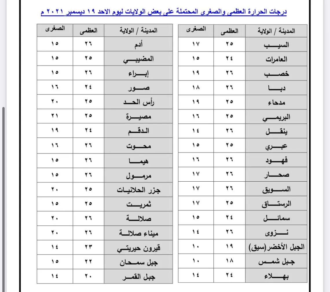 إليكم درجات الحرارة في بعض مناطق و ولايات السلطنة: