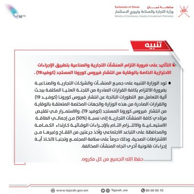 أصدرت وزارة التجارة والصناعة وترويج الاستثمار في حسابها الرسمي عبر موقع “تويتر” تنبيه بضرورة التزام المنشآت التجارية والصناعية بتطبيق الإجراءات الاحترازية الخاصة بالوقاية من انتشار فيروس كورونا المستجد (كوفيد19).