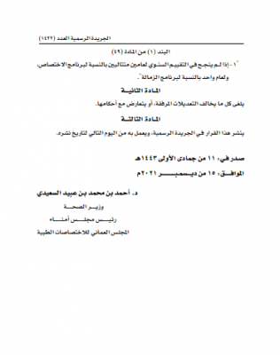 أصدر معالي الدكتور أحمد بن محمد بن عبيد السعيدي وزير الصحة قرارًا وزاريًا رقم 43 / 2021 بتعديل بعض أحكام لائحة التدريب في المجلس العماني للاختصاصات الطبية: