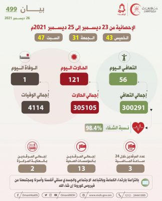 أعلنت وزارة الصحة عن تسجيل 121 إصابة جديدة بفيروس كورونا ووفاة واحدة خلال الثلاث الأيام الماضية