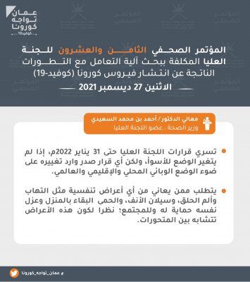 ”تسري قرارات اللجنة العليا حتى 31 يناير 2022م، إذا لم يتغير الوضع للأسوأ، ولكن أي قرار صدر وارد تغييره على ضوء الوضع الوبائي المحلي والإقليمي والعالمي”