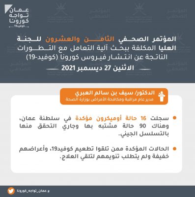 وهج الخليج-مسقط صرح الدكتور سيف بن سالم العبري أن السلطنة سجلت 16 حالة أوميكرون مؤكدة في سلطنة عمان، وهناك 90 حالة مشتبه بها وجاري التحقق منها بالتسلسل الجيني"