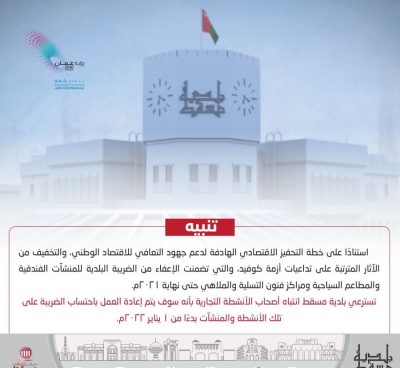 بلدية مسقط تعيد العمل باحتساب الضريبة البلدية على الأنشطة التجارية والمنشآت الفندقية والمطاعم السياحية، ودور التسلية والملاهي.