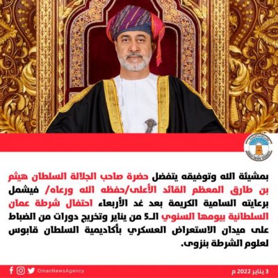 الرئيسية/أخبار محلية/جلالة السلطان المعظم يرعى احتفال شرطة عمان السلطانية بيومها السنوي أخبار محلية جلالة السلطان المعظم يرعى احتفال شرطة عمان السلطانية بيومها السنوي03/01/2022. 03/01/2022وهج الخليج_ مسقطShare on:WhatsApp03/01/2022. 03/01/2022 فيسبوك X لينكدإن Tumblr بينتيريست Reddit VKontakte مشاركة عبر البريد طباعة