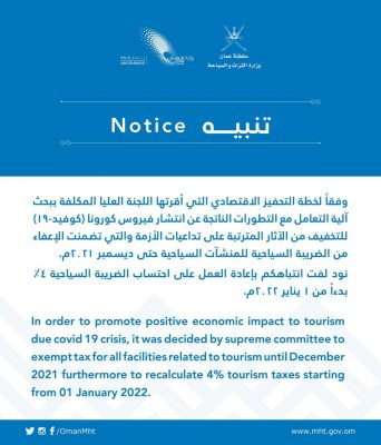 وهج الخليج_ مسقط أصدرت وزارة التراث والسياحة تنبيها بإعادة العمل على احتساب الضريبة السياحية بداية من 1 يناير 2022م، وفقا للمنشور أدناه :