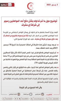 نشرت وزارة الصحة بيانا حول ما تم تداوله في وسائل التواصل الاجتماعي من تغريدة لأحد المواطنين العائدين من السفر ذكر فيها بأنه لم يُسمح له بالخروج من المطار إلّا بعد دفع رسوم إلى شركة إي مشرف.