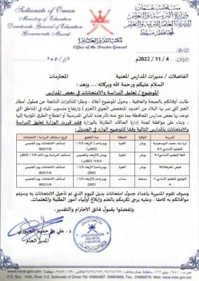 وهج الخليج_ مسقط أعلنت المديرية العامة للتربية والتعليم بمسقط عن تعليق الدراسة غدا الأربعاء 5 يناير 2022 في بعض المدارس.