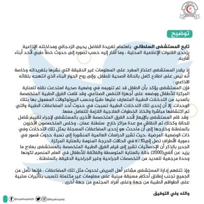 المستشفى السلطاني يصدر توضيحاً رداً على أحد المغردين بشأن حدوث خطأ طبي لطفل