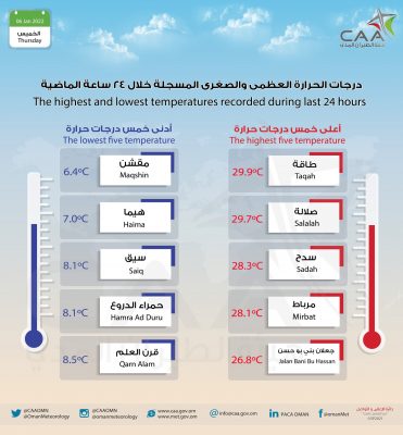انخفاض درجات الحرارة إلى الصفر المئوي على قمم الجبال كما سجلت بعض محطات الرصد في المناطق الصحراوية أقل من عشر درجات خلال 24 ساعة الماضية.