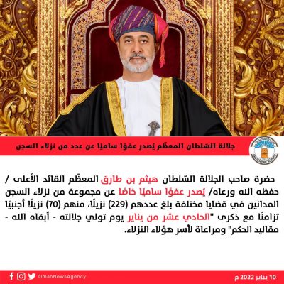 وهج الخليج-مسقط جلالة السّلطان المعظّم يُصدر عفوًا ساميًا عن عدد من نزلاء السجن.