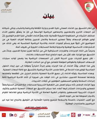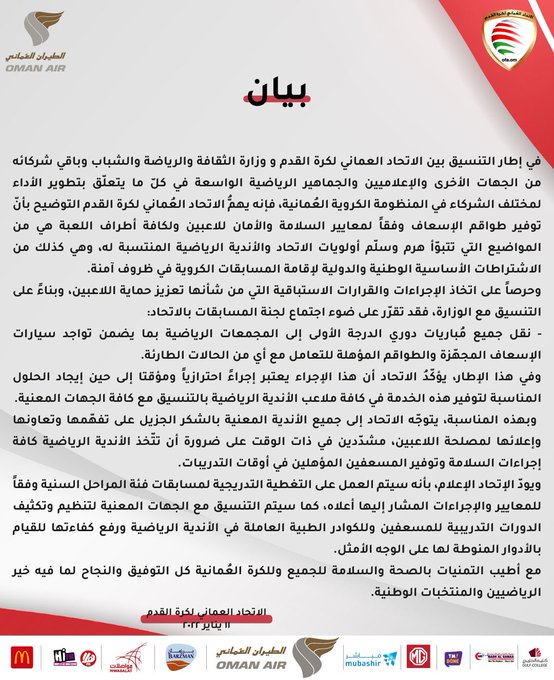 قررت الاتحاد العماني لكرة القدم في بيان له نقل جميع مُباريات دوري الدرجة الأولى إلى المجمعات الرياضية بما يضمن تواجد سيارات الإسعاف المجهّزة والطواقم المؤهلة للتعامل مع أي من الحالات الطارئة.