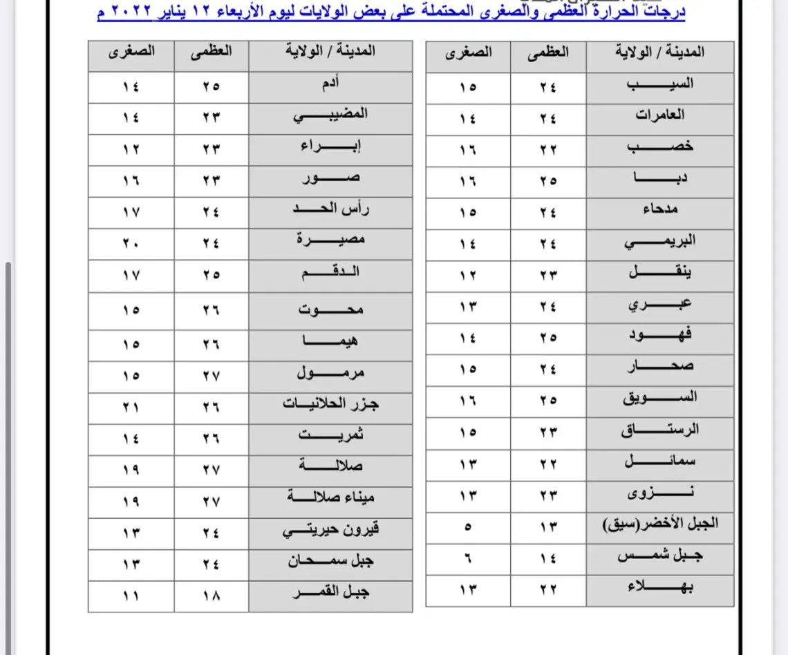 سيكون طقس اليوم الأربعاء صحوًا بوجه عام على معظم محافظات السلطنة مع تدفق السحب على شمال سلطنة عمان وفرص تشكل السحب المنخفضة على سواحل بحر عمان. واحتمال تشكل الضباب في آخر الليل والصباح الباكر على أجزاء من محافظات الظاهرة ، الوسطى و ظفار.