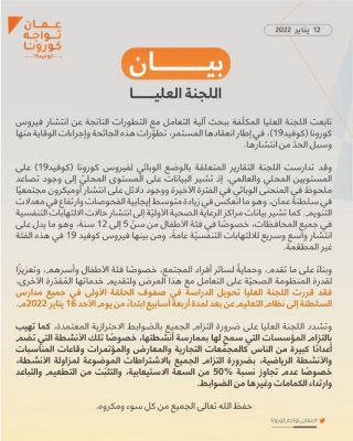 قررت اللجنة العليا تحويل الدراسة في صفوف الحلقة الأولى في جميع مدارس سلطنة عُمان إلى نظام التعليم عن بُعد لمدة أربعة أسابيع ابتداءً من يوم الأحد 16 يناير الجاري.