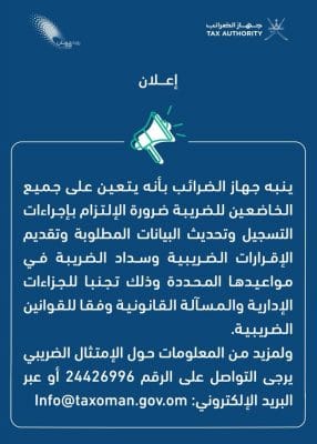 ودعى فيه جميع الخاضعين للضريبة بضرورة الالتزام بإجراءات التسجيل وتحديث البيانات المطلوبة وتقديم الإقرارات الضريبية وسداد الضريبة في مواعيدها المحددة وذلك تجنبًا للجزاءات الإدارية والمسألة القانونية وفقا للقوانين الضريبية.