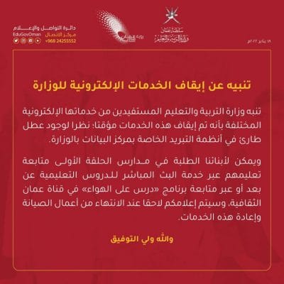 وأكدت الوزارة على إمكانية متابعة الطلبة في مدارس الحلقة الأولى تعليمهم عبر خدمة البث المباشر للدروس التعليمية عن بعد أو عبر متابعة برنامج « درس على الهواء » في قناة عمان الثقافية ، مضيفة ً أنه سيتم الإعلان لاحقا عند الانتهاء من أعمال الصيانة وإعادة هذه الخدمات .