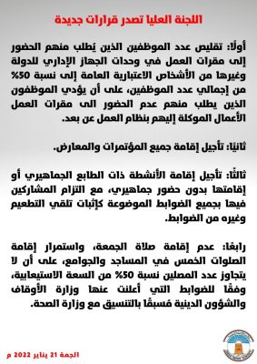 أصدرت اللجنة العليا المكلفة ببحث آلية التعامل مع التطورات الناتجة عن انتشار فيروس كورونا كوفيد 19 4 قرارات جديدة وهي كالآتي: