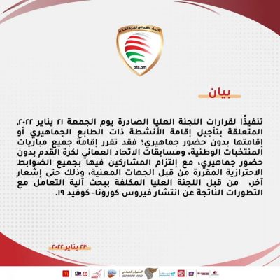 وهج الخليج-مسقط تنفيذاً لقرارات اللجنة العليا، تقرر إقامة مباريات المنتخبات الوطنية ومسابقات الاتحاد العُماني لكرة القدم بدون حضور جماهيري، حتى إشعار آخر: