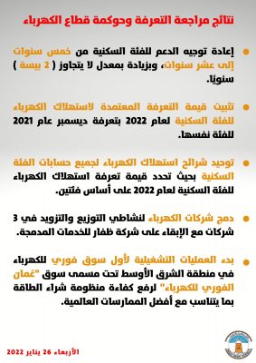 إعادة توجيه الدعم لقطاع الكهرباء للفئة السكنية من خمس سنوات إلى عشر سنوات، وبزيادة بمعدل لا يتجاوز (2 بيسة)سنويًا مع تثبيت قيمة التعرفة المعتمدة لاستهلاك الكهرباء للفئة السكنية لعام 2022 بتعرفة ديسمبر عام 2021 للفئة نفسها.