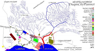وهنا مخطط شامل لمدينة الدقم يتضمن شبكة الطرق و البنية التحتية.