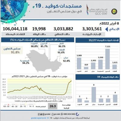 نشر الحساب الرسمي للمركز الإحصائي لدول مجلس التعاون لدول الخليج العربية عبر موقع “تويتر” والذي يعتبر المصدر الرسمي للبيانات والمعلومات والإحصاءات لدول مجلس التعاون عن التقرير اليومي لإحصائيات فيروس كورونا كوفيد_19 الإجمالية في دول مجلس التعاون لدول الخليج العربية، حتى تاريخ 8 فبراير 2022م.