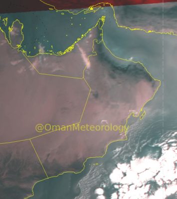 وكشفت الأرصاد عن صورة جوية في حسابها الرسمي عبر موقع “تويتر” توضح تكثف السحب المنخفضة على أجزاء من محافظات البريمي وجنوب الشرقية والوسطى وأجزاء من سواحل بحر عمان(جنوب الباطنة).