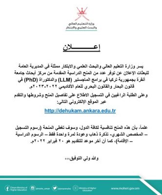 أعلنت وزارة التعليم العالي والبحث العلمي والابتكار عن منح دراسية مقدمة من مركز أبحاث جامعة أنقرة بجمهورية تركيا للعام الأكاديمي 2022-2023م.
