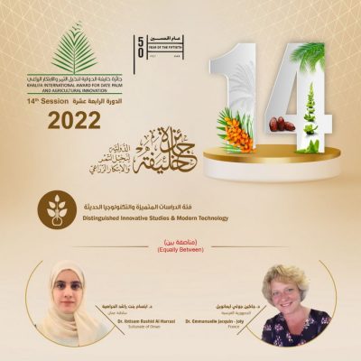 حصلت الدكتورة ابتسام بنت راشد الحراصية باحثة تقنية حيوية بالمديرية العامة للبحوث الزراعية والحيوانية على جائزة خليفة الدولية لنخيل التمر والابتكار الزراعي عن فئة الدراسات المتميزة والتكنولوجيا الحديثة.