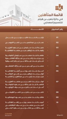 وأسفرت نتائج التقييم عن تأهل 10 مشاركات للتصفيات النهائية لـ ⁧‫جائزة بلعرب بن هيثم‬⁩ للتصميم المعماري، و تنوعت المشاركات بين المعالم المعمارية والمجسمات والمباني المستوحاة من الثقافة العُمانية، بالإضافة إلى المنشآت التجارية.