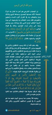 قال سماحة الشيخ أحمد بن حمد الخليلي – مفتي عام سلطنة عمان ، عبر حسابه الرسمي على موقع “تويتر” : إن الحجاب الشرعي هو أعز ما تعتز به المرأة المسلمة لأنه حصنها الحصين، وحماها المنيع، ولذلك بدئ بالخطاب به في القرآن أكرم النساء وأعفهن وأطهرهن، فقد صدر الخطاب به بتوجيهه إلى بيت النبوة الطاهر أزواج النبي ﷺ وبناته، ومن بعدهن وُجه إلى سائر نساء المؤمنين.